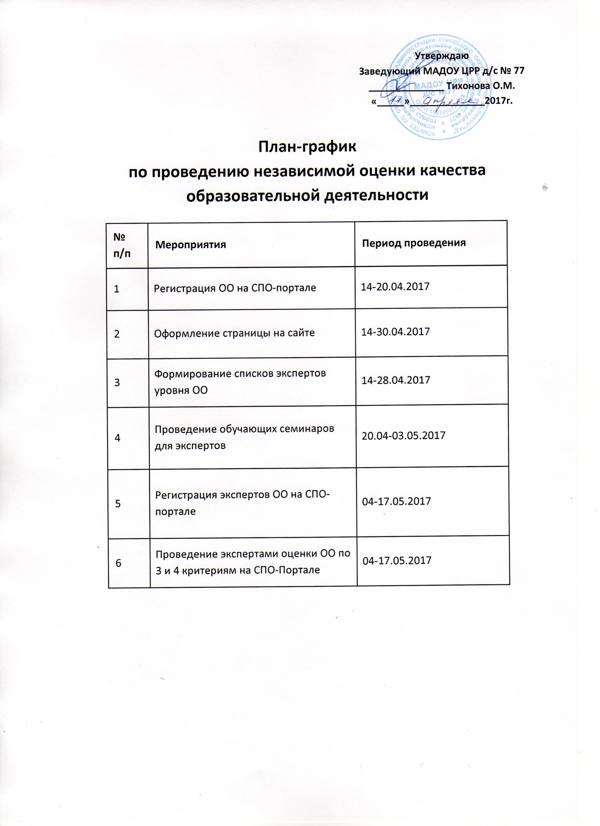 ПЛАН ПРОВЕДЕНИЯ НЕЗАВИСИМОЙ ОЦЕНКИ КАЧЕСТВА: